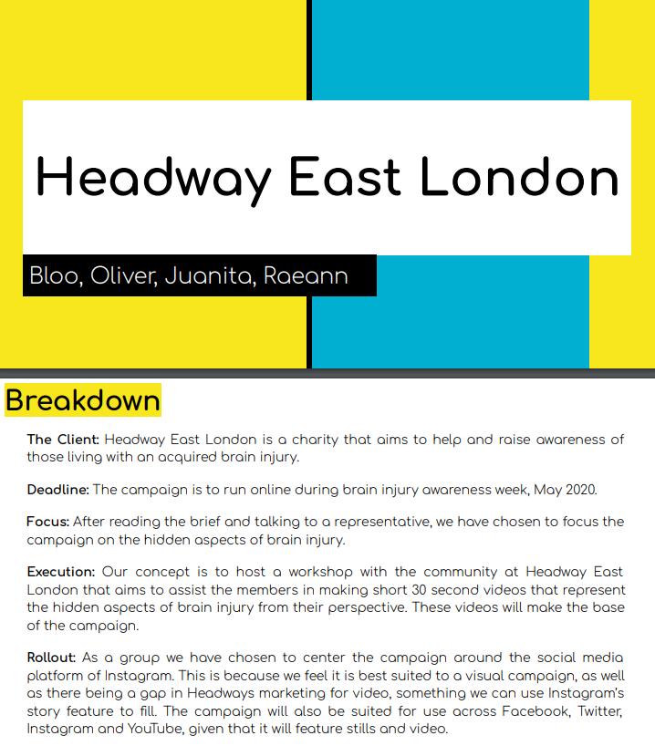 Now that we have reached the end of the live brief project and delivered the final pitch, it is important to have a debriefing and review the project. As we are all approaching the deadlines for assignments this term and trying to keep up with the workload, as well as jobs and other life demands, it seemed that there was not time that we could arrange where everyone could be present to do a debriefing discussion. I took it upon myself to start a document and share this with the rest of the team so they could add to it in their own time. It seemed the best solution to allow collaboration for a team working remotely. These are some of the main points extracted from this: