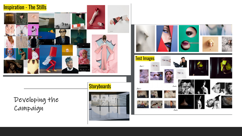 The one concern I have and which I raised with the group, is that I cannot see the link between our video concept and the photographic stills we are creating. This leaves me feeling there is a lack of coherence in the design of this pitch and it actually feels like we are almost creating two entirely different campaigns. We will continue this week to create more content for the presentation to put forward to the tutors next week and will start compiling a folder of the work that will be put into a presentation. I will not be able to attend the next group meeting due to work demands so this is rather disappointing but I will contribute as much as I can prior to the meeting and will rely on the group to update me on the feedback.